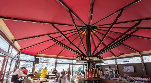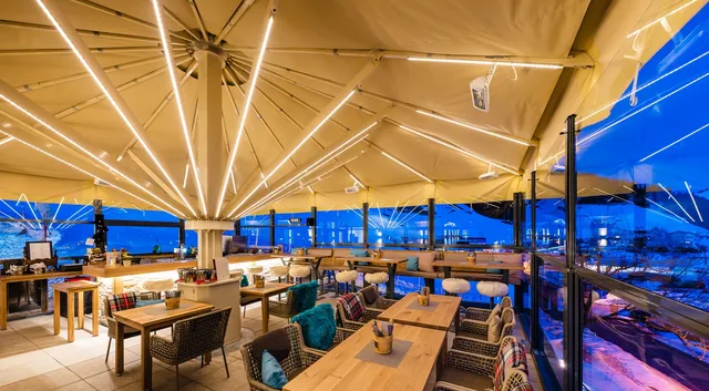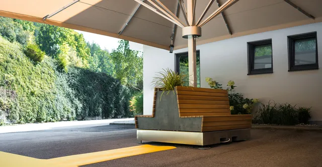 This covering is a fire-resistant, exceptionally resilient and coated outdoor fabric that can withstand any weather conditions. Due to the heavier material and the high grammage, the solution is more wind-resistant and snow slides off more easily than from a textured acrylic fabric - this makes it a particularly interesting fabric for exposed locations. Further advantages are: welded and therefore tighter and more reliable seams, improved noise protection and easy cleaning. Available in many different colors.