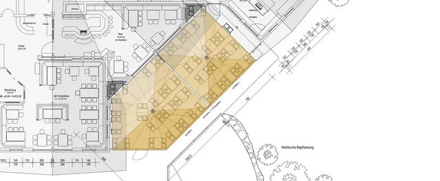 It is no wonder then that when planning a new structure, multiple usage possibilities in both the winter and summer season are taken into consideration. This applied to the new construction of Leithe Wirt restaurant above Serfaus, located right at the exit to the valley. From the start, integration of flexible usage of the large sun patio was part of the concept. Given the positive experiences in the immediate environment, a solution with Meissl large umbrellas was chosen. Supplemented by fully glazed wind walls, a quick and perfect transformation of the open-air space in front of the building made an additional guest area possible. A special connection to the roof front and an umbrella in a special pentagonal format allow for total weatherproof covering, thus creating attractive seating for over 100 guests in inclement weather or in the evening. Electrical sliding walls allow free access from all sides. Infrared heaters are mounted on the frame of the wind walls to ensure a cozy atmosphere when the mountain weather does not cooperate.