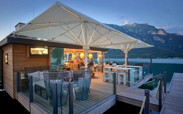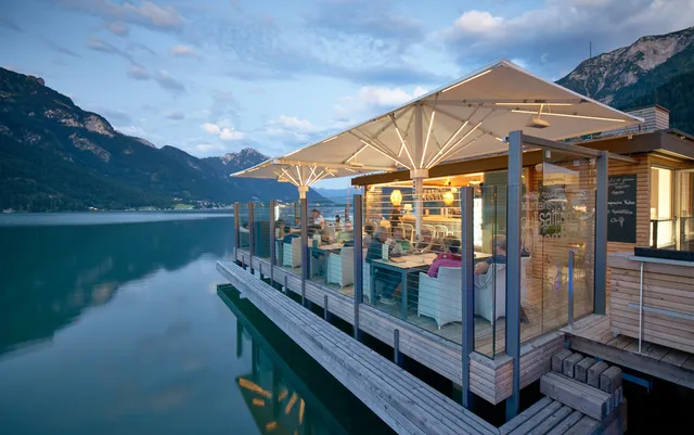Familie Kobinger und ihr Team stehen seit Wochen in der Startlöchern. Sie wollen endlich wieder viele nette Gäste auf dem hauseigenen Restaurant-Steg auf dem Achsensee glücklich machen. Dass die sonst so zahlreichen Besucher hier – in bester Lage direkt neben der Schiffsanlegestelle – gern sitzenbleiben, auch wenn die Sonne nicht (mehr) scheint oder Wolken aufziehen, machen vier Meissl-Großschirme möglich. Drei davon sind jeweils 4 x 6 Meter groß und ein Schirm wurde extra im Maß 5,5 x 4 Meter angefertigt. Alle Großschirme sind mittels praktischer Regenrinnen miteinander verbunden und auf einer Stahlwannen-Konstruktion befestigt.