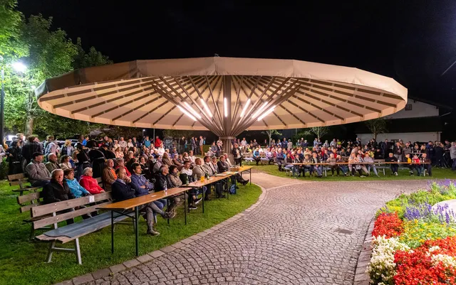 So hoch wie die Schirmspitze waren auch die Ansprüche an diesen Riesenschirm in der Gemeinde Ramsau: Er muss nicht nur außerordentlich stabil sein, sondern auch in einem statisch geprüften und bestens vorbereiteten Fundament montiert werden. Apropos Montage: Die imposante und sehr ausgeklügelte Schirmkonstruktion wurde in Einzelteilen angeliefert und vor Ort zusammengebaut. Dafür waren vier starke Männer, ein LKW mit Montagekran, eine Hebebühne und ergänzend eine Drehleiter der örtlichen Feuerwehr im Einsatz. Ganze 1,5 Tage hat die spektakuläre Montage gedauert, inkl. Einweisung für den Bürgermeister und seine Gemeinde-Mitarbeiter. Und danach? Wurde beim Musikfest erst einmal so richtig das 50-jährige Vereinsjubiläum der Trachtenblaskapelle Ramsau gefeiert – unterm neuen Schirm, versteht sich. Der ist übrigens ein Jahreszeit-Allrounder für allerlei Anlässe, wie z. B. den winterlichen Weihnachtsmarkt. Und falls er mal längere Zeit geschlossen bleibt, bekommt er einfach eine Schutzhülle verpasst!