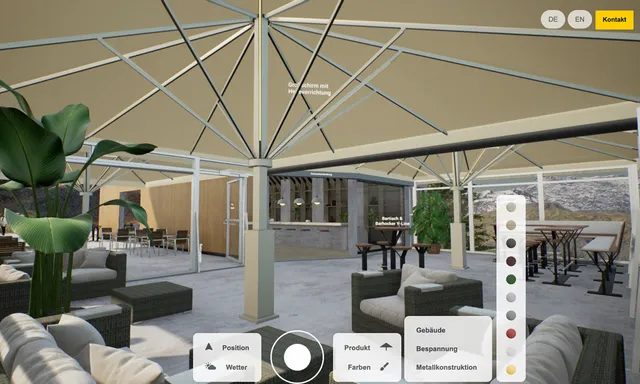 Der große Aufwand war und ist es wert: Damit wir unsere Kunden auch virtuell optimal beraten können, haben wir während der Pandemie einen virtuellen Showroom entwickelt, der bislang fast 2.000 x besucht wurde. Das hat gute Gründe: Sie bekommen ein viel besseres Grundverständnis für das Meissl Angebot, sehen alles aus verschiedenen Perspektiven, erleben Funktionen wie real in Echtzeit, z. B. wenn sich Schirme bei Regen öffnen oder schließen und vieles mehr. Zahlreiche Kunden nutzen das Tool auch zur Planung und können somit sehr fundierte Entscheidungen für Ihre neuen Terrassenlösungen treffen. Oder wir nehmen aus dem Showroom heraus direkt die im parallelen Telefonat mit dem Kunden ausgewählten Produkte, kombinieren sie mit den Vor-Ort-Plänen des Kunden und erhalten so erstklassige 3D Visualisierungen. Und jetzt ist eben auch farblich so gut wie alles möglich!