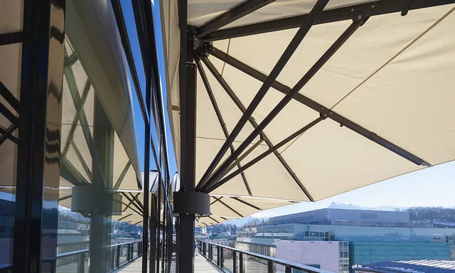 Der Halbschirm setzt sich zunehmend überall dort durch, wo Architekten und Planungsbüros eine Lösung für kleine Terrassen oder Balkone suchen. Denn nichts eignet sich besser als platzsparende und elegante Alternative zur Markise, Und als perfekte Anbindung an Gebäude, wenn es keine Befestigungsmöglichkeiten gibt, z. B. an Glasfassaden. Was Halbschirme von Meissl auszeichnet, sind die gewohnte Stabilität für den anspruchsvollen Einsatz sowie die zahllosen individuellen Größen- und Designvarianten. Und natürlich bekommen Sie einen oder mehrere Halbschirme auch mit Beleuchtung, Heizstrahlern oder Soundsystem – damit auch der halbe Schirm zur ganz runden Sache wird.