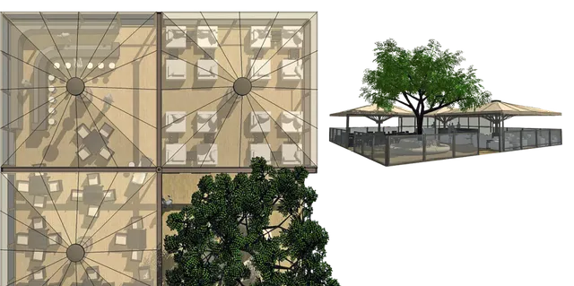 Grundsätzlich lassen sich die Gestaltungs- und Funktionselemente der Bar mit den unterschiedlichsten Schirmformaten kombinieren. Bilden Bar und Schirmfundament keine Einheit, dann ist die Flexibilität sogar noch größer. Zugleich erlaubt diese Lösung die Berücksichtigung spezifischer baulicher Eigenheiten, etwa Anschlüsse, Zugänge usw., ohne Beeinflussung der Platzierung des Schirms. Allerdings lassen sich bei integrierten Lösungen Bedienelemente direkt am Schirmständer anbringen.