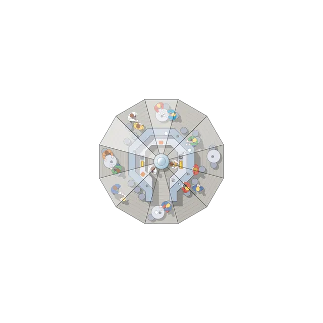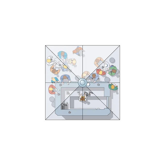 Die Trennung von Schirmfundament und Barkorpus ermöglicht eine größere Flexibilität in der Gestaltung und schafft zugleich zwei unbewusste Zentren, an denen sich die Gäste sammeln. So lässt sich der Raum unauffällig gliedern. Auch die gestreckte Form der von beiden Seiten zugänglichen Bar erlaubt es, Angebotsschwerpunkte zu setzen, etwa mit Schankanlagen und Snackzubereitung.